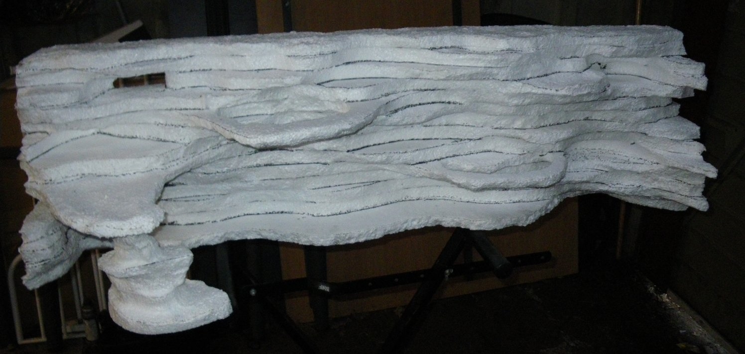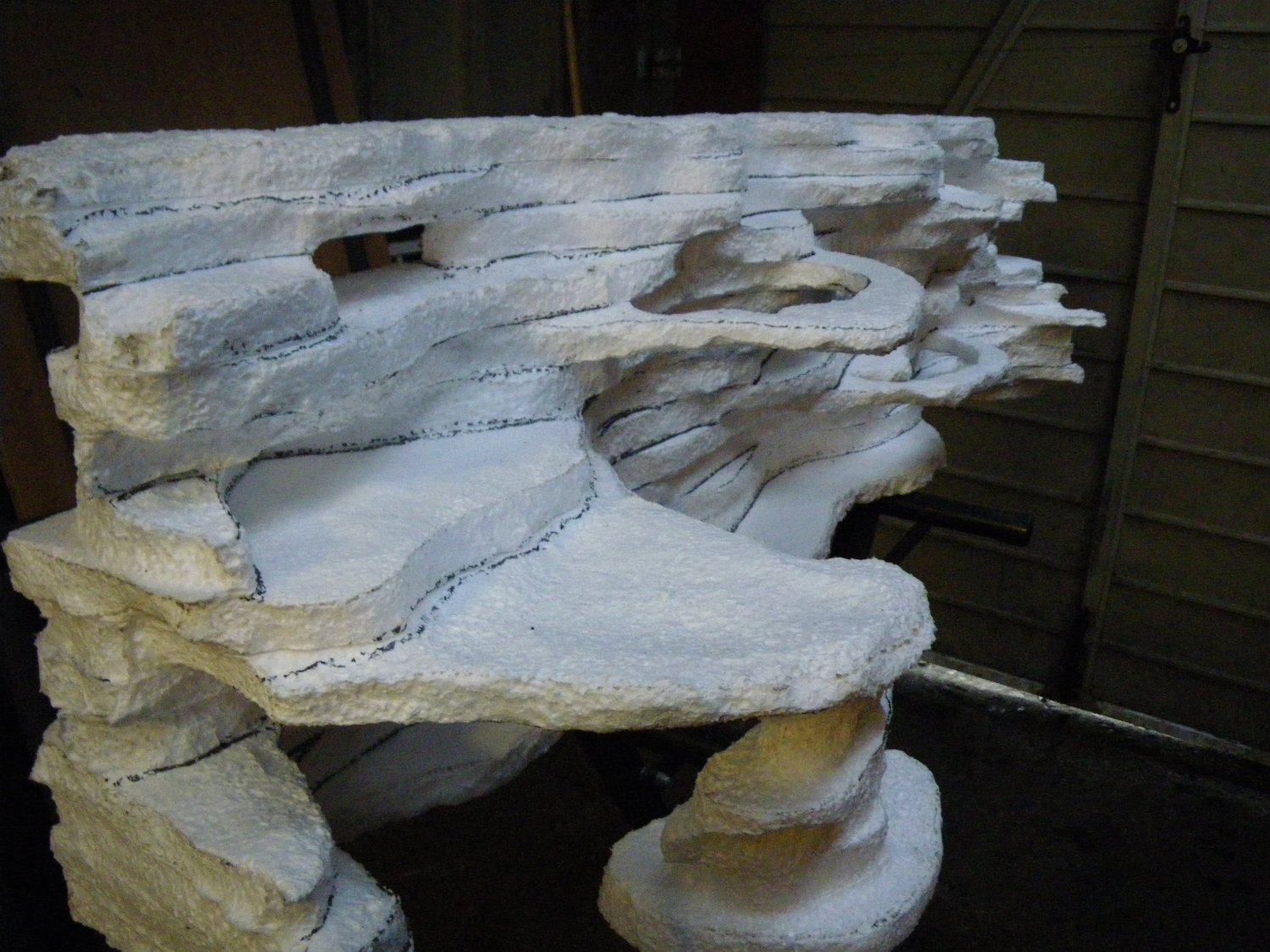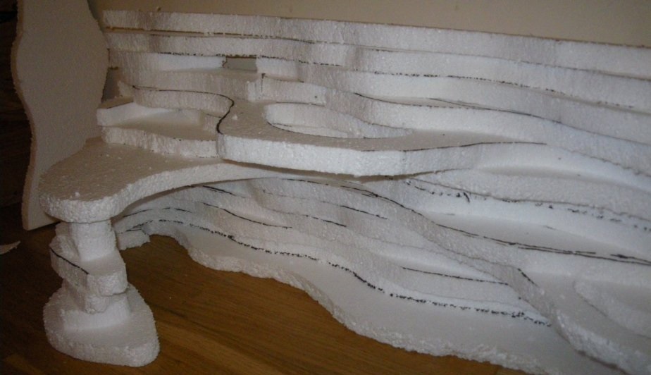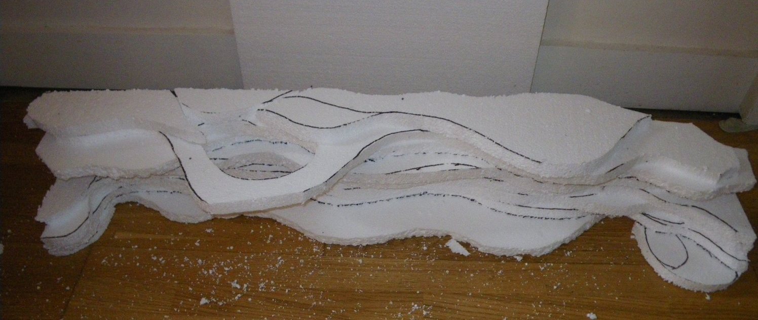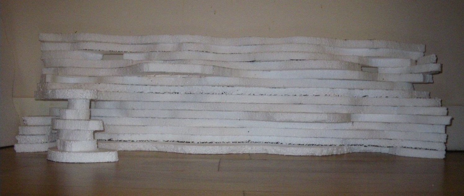 Az itt bemutatott hátteret semmivel sem nehezebb elkészíteni mint az előzőeket. Csupán más az építési módszer. Ebben az esetben a hungarocell darabokat egymásra rakjuk, mint az építőkockákat, így építve fel a hátteret. A hungarocell lapokból kivágjuk a rétegeket, majd egymásra rakjuk, összepróbáljuk.