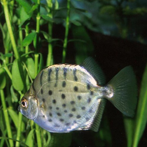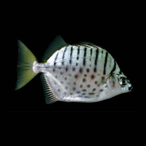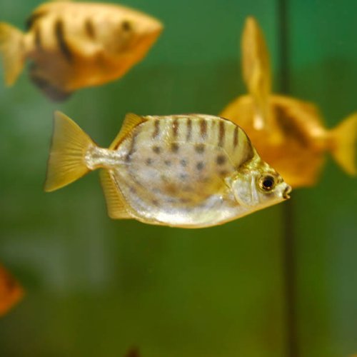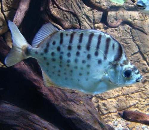 A Sokcsíkú árgushal teste oldalról lapított, zöldes-ezüstös színű. Az oldalának a felső részén 7-12 keskeny, függőleges, sötét sáv fut, amelyek alsó fele szakadozott, inkább pöttyökre emlékeztet. Testükhöz képest a fejük és szájuk is kicsi. Érzékenyek a nitrátokra, és mivel sokat esznek, ezért a heti rendszeres vízcsere és az erős szűrés elengedhetetlen medencéjükben. A fiatal halakat rövidebb ideig tarthatjuk édesvízben is, de a felnőtt egyedeknek már mindenképpen kell a brakkvíz, vagy tengervíz.