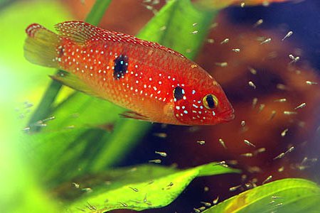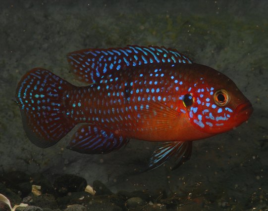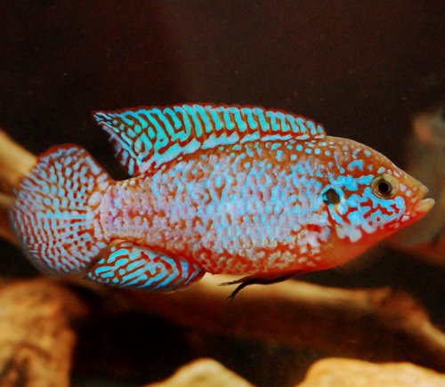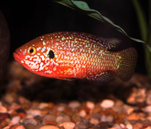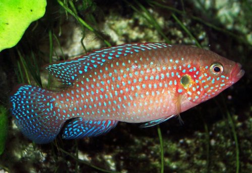 Érdemes 5-6 fiatal halat beszerezni, és felnevelni, mert így könnyebben választanak párt maguknak, persze ehhez több idő kell. Kifejlett korban már nehezebb megfelelő párokat összeválogatni. Amit egy pár kialakul, érdemes a többi halat kivenni a medencéből, mert a pár megölheti azokat. A kialakult pár egy életen keresztül együtt marad. Az ívás idején agresszívvé válhatnak, az öreg hímek sokszor még nőstényeiket is tönkreteszik, gyakran még az ember kezét is megharapják. A hímek valamivel talán nagyobbak, de íváskor a nőstények szebb, vörös, zöld pettyekkel díszített nászruhában tündökölnek.