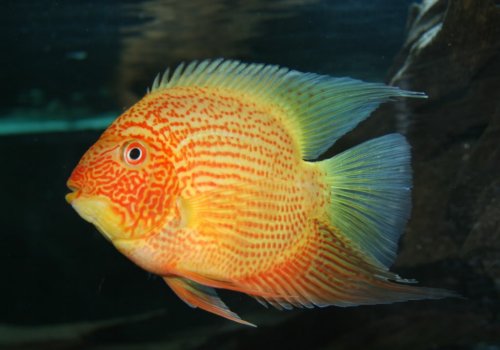 A formája és egyszerűbb tartása miatt népi diszkosznak is nevezik. A szemfoltos tarkasügér teste ovális, oldalról lapított, szeme nagy és vörös színű, szája kicsi.