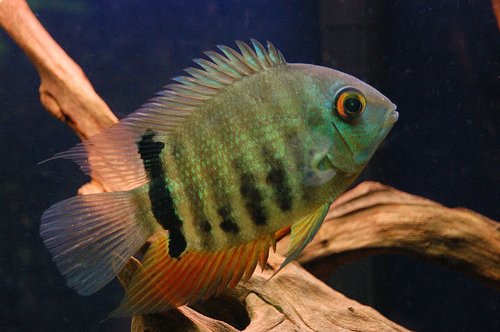 Területvédő, de nyugodt, barátságos viselkedésű sügér. Más nagyobb testű nem agresszív halakkal jól együtt tartható.