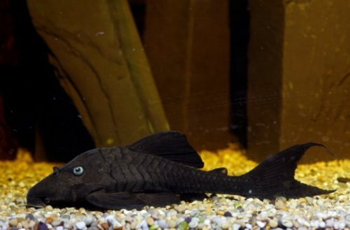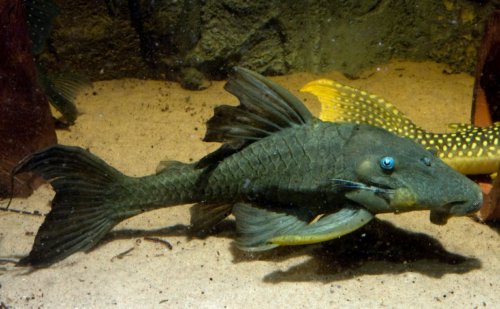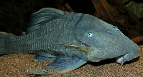 A Kékszemű vértesharcsa testét a hasa kivételével mindenhol csontos lemezek borítják. A feje széles, lapos és nagy. A száj a fej alsó részén található és szívókorongra emlékeztet. Az egész teste fekete színű, és gyönyörű kék szemei vannak. A hátúszó vitorlaszerűen felfelé áll.