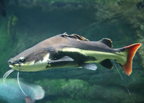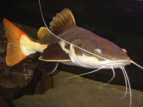 A vörösfarkú harcsa teste hosszúkás, feje lapos. Három pár bajuszszála a száj környékén található. Teste a háti részen sötét színű, fején apró fekete pöttyök találhatóak. A farok tövétől a szájig egy széles fehér sáv hózódik a test oldalsó és alsó részén. Az úszók fekete színűek, kivéve a farokúszót, ami élénkvörös színű. A hátúszó felső része is narancssárga, vagy vörös színű. Létezik albínó színváltozata is, de ezek nagyon ritkák.
