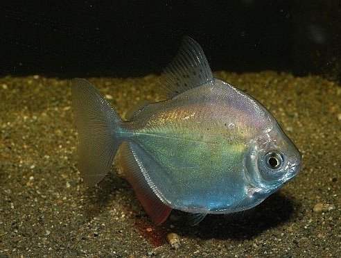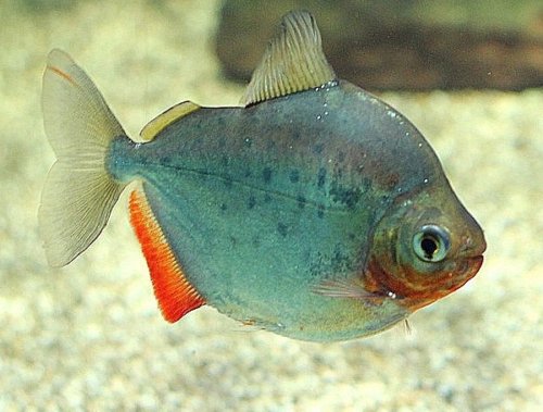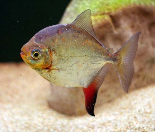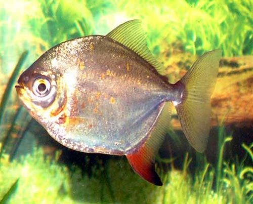 Teste oldalról lapított, háta magas. Két színváltozata létezik, az első teste teljesen ezüstszínű, míg a másik testén narancssárga foltok is találhatóak (Myloplus rubripinnis luna). Az úszói – a farok alatti úszót kivéve – színtelenek. A farok alatti úszó íves, megnyúlt és vörös színű, a vége pedig fekete, amelyről a nevét is kapta. Az állkapcsa erős, és jó fogai is vannak, amellyel a növényeket könnyen széttépik, de akár a kisebb halakat is megeszik. Ezeket a békés halakat legalább 5 fős csapatban kell tartani, mert különben félénké vállnak.